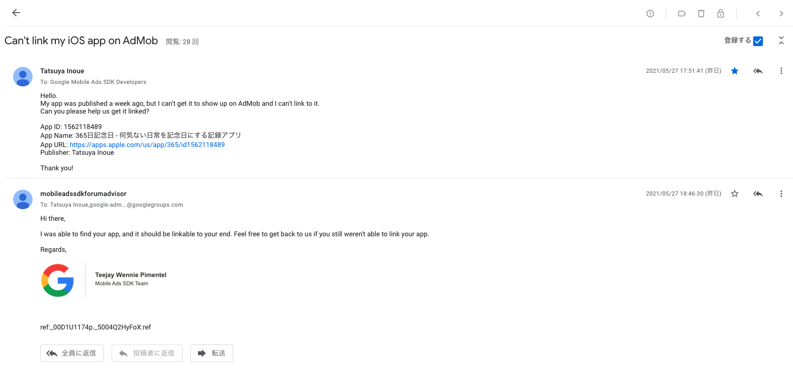 最近(2021年5月)はAdMobのiOSリンクが遅れているようで、下記のフォーラムから問い合わせることですぐにリンクされました!